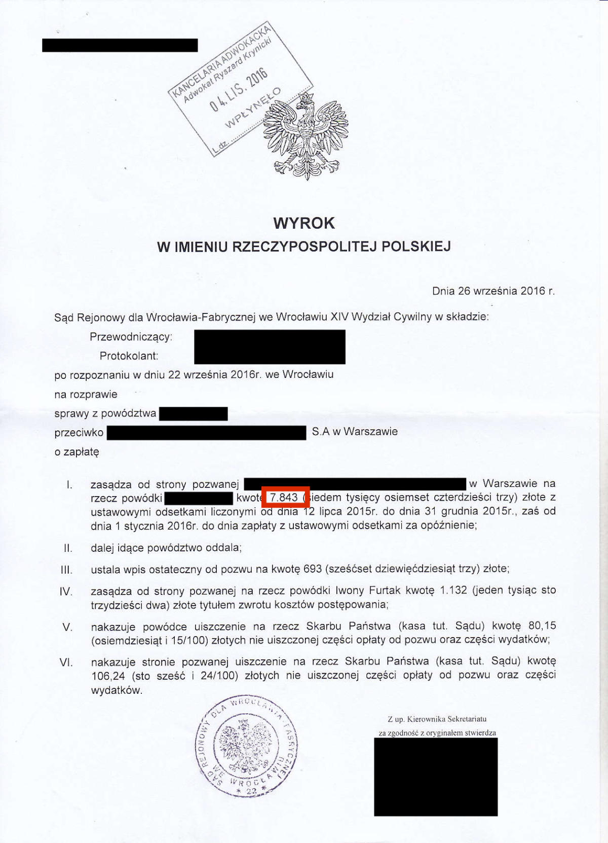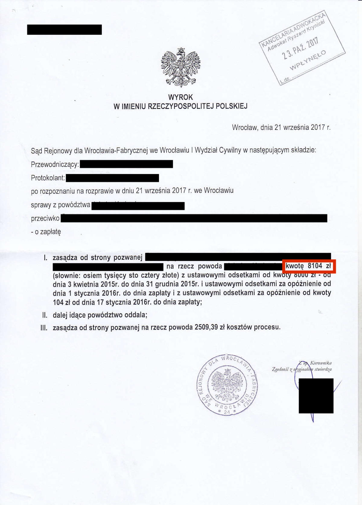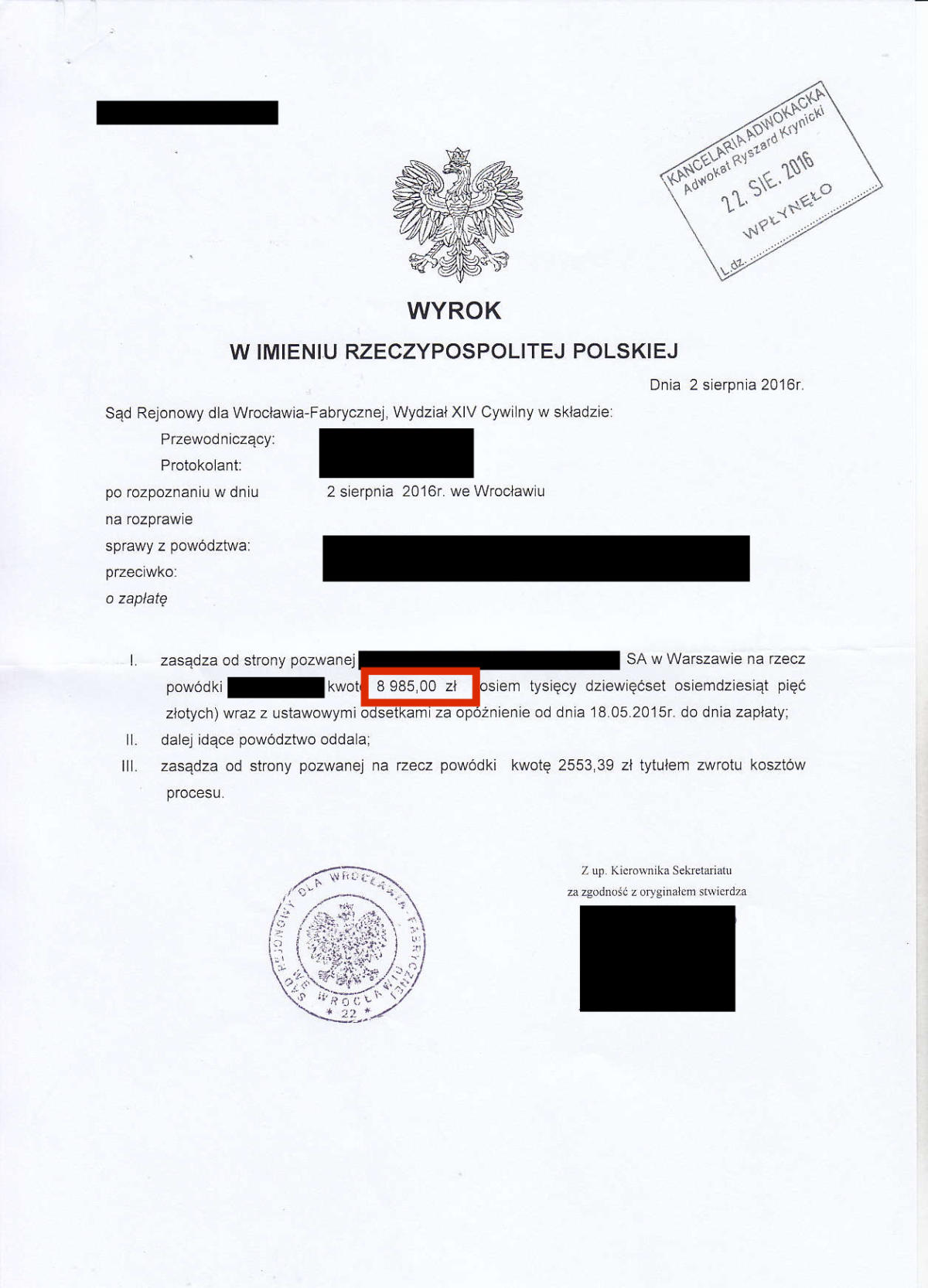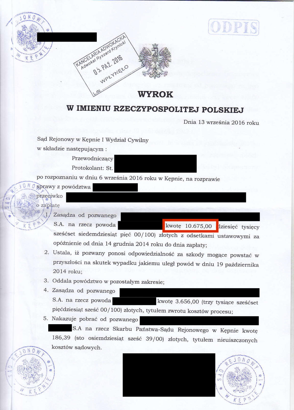 Przez ostatnie klika lat odzyskaliśmy dla Naszych klientów prawie 10.000.000 złotych. Poniżej przedstawimy kilkadziesiąt wybranych wyroków z Naszych spraw. Jest to tylko niewielki ułamek spraw, które do tej pory wygraliśmy. Odszkodowanie w wysokości 39.524 zł Odszkodowanie w wysokości 26.713 zł Odszkodowanie w wysokości 19.000 zł Odszkodowanie w wysokości 36.744 zł Odszkodowanie w wysokości 18.806,60 zł Odszkodowanie w wysokości 16.504,90 zł Odszkodowanie w wysokości 13.265 zł Odszkodowanie w wysokości 100.000 zł Odszkodowanie w wysokości 13.000 zł Odszkodowanie w wysokości 20.000 zł Odszkodowanie w wysokości 11.385 zł Odszkodowanie w wysokości 11.350 zł Odszkodowanie w wysokości 10.400 zł Odszkodowanie w wysokości 120.000 zł Odszkodowanie w wysokości 10.000 zł Odszkodowanie w wysokości 11.000 zł Odszkodowanie w wysokości 12.560,99 zł Odszkodowanie w wysokości 29.035,32 zł Odszkodowanie w wysokości 10.675 zł Odszkodowanie w wysokości 10.285 zł Odszkodowanie w wysokości 160.000 zł Odszkodowanie w wysokości 10.185 zł Odszkodowanie w wysokości 140.000 zł 23Odszkodowanie w wysokości 15.032 zł Odszkodowanie w wysokości 9.433 zł Odszkodowanie w wysokości 11.525 zł Odszkodowanie w wysokości 11.393,59 zł Odszkodowanie w wysokości 10.238 zł Odszkodowanie w wysokości 14.401,85 zł Odszkodowanie w wysokości 13.425 zł Odszkodowanie w wysokości 16.300 Odszkodowanie w wysokości 20.906,46 zł Odszkodowanie w wysokości 11.560 zł Odszkodowanie w wysokości 10.001 zł Odszkodowanie w wysokości 28.997 zł Odszkodowanie w wysokości 11.140 zł Odszkodowanie w wysokości 8.104 zł Odszkodowanie w wysokości 8.985 zł Odszkodowanie w wysokości 7.843 zł Odszkodowanie w wysokości 61.885 zł Odszkodowanie w wysokości 11.645 zł Odszkodowanie w wysokości 8.561 zł Odszkodowanie w wysokości 12.365 zł Odszkodowanie w wysokości 14.743,49 zł