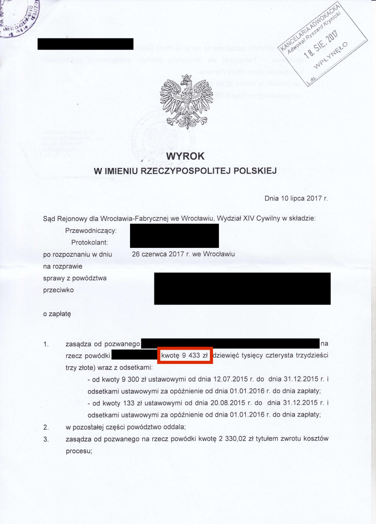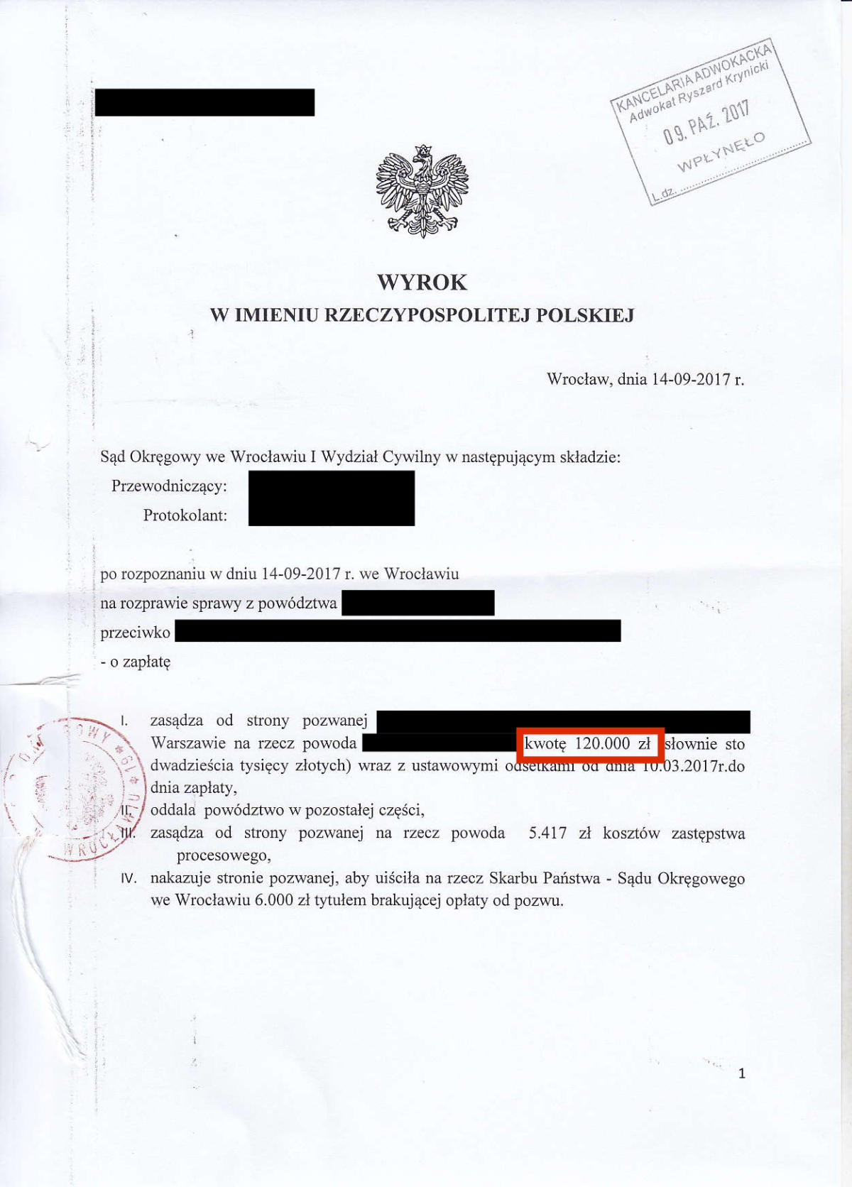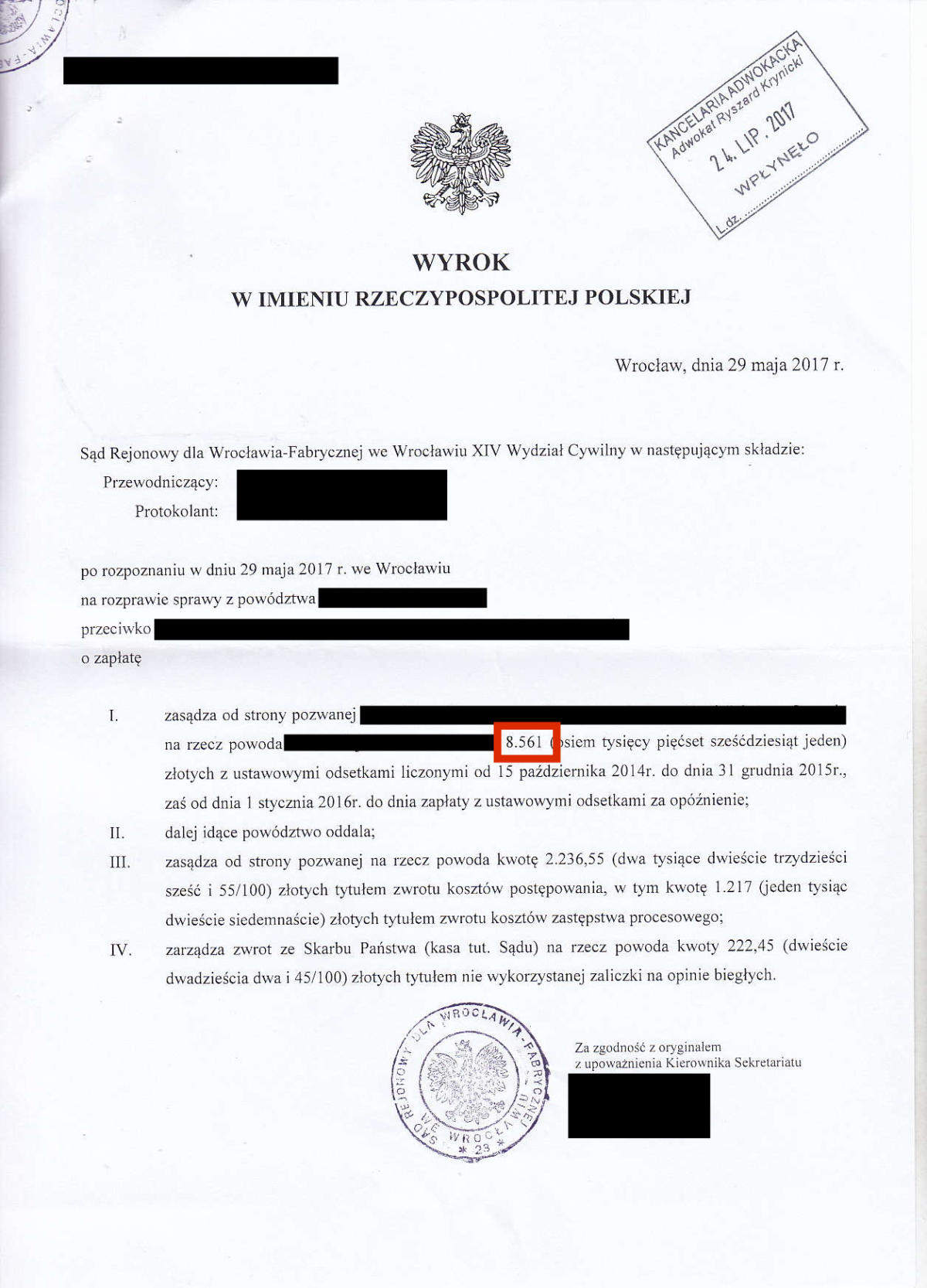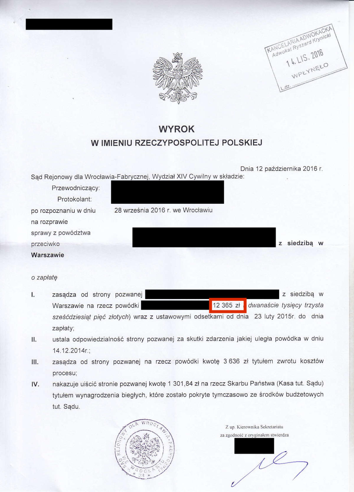 Przez ostatnie klika lat odzyskaliśmy dla Naszych klientów prawie 10.000.000 złotych. Poniżej przedstawimy kilkadziesiąt wybranych wyroków z Naszych spraw. Jest to tylko niewielki ułamek spraw, które do tej pory wygraliśmy. Odszkodowanie w wysokości 39.524 zł Odszkodowanie w wysokości 26.713 zł Odszkodowanie w wysokości 19.000 zł Odszkodowanie w wysokości 36.744 zł Odszkodowanie w wysokości 18.806,60 zł Odszkodowanie w wysokości 16.504,90 zł Odszkodowanie w wysokości 13.265 zł Odszkodowanie w wysokości 100.000 zł Odszkodowanie w wysokości 13.000 zł Odszkodowanie w wysokości 20.000 zł Odszkodowanie w wysokości 11.385 zł Odszkodowanie w wysokości 11.350 zł Odszkodowanie w wysokości 10.400 zł Odszkodowanie w wysokości 120.000 zł Odszkodowanie w wysokości 10.000 zł Odszkodowanie w wysokości 11.000 zł Odszkodowanie w wysokości 12.560,99 zł Odszkodowanie w wysokości 29.035,32 zł Odszkodowanie w wysokości 10.675 zł Odszkodowanie w wysokości 10.285 zł Odszkodowanie w wysokości 160.000 zł Odszkodowanie w wysokości 10.185 zł Odszkodowanie w wysokości 140.000 zł 23Odszkodowanie w wysokości 15.032 zł Odszkodowanie w wysokości 9.433 zł Odszkodowanie w wysokości 11.525 zł Odszkodowanie w wysokości 11.393,59 zł Odszkodowanie w wysokości 10.238 zł Odszkodowanie w wysokości 14.401,85 zł Odszkodowanie w wysokości 13.425 zł Odszkodowanie w wysokości 16.300 Odszkodowanie w wysokości 20.906,46 zł Odszkodowanie w wysokości 11.560 zł Odszkodowanie w wysokości 10.001 zł Odszkodowanie w wysokości 28.997 zł Odszkodowanie w wysokości 11.140 zł Odszkodowanie w wysokości 8.104 zł Odszkodowanie w wysokości 8.985 zł Odszkodowanie w wysokości 7.843 zł Odszkodowanie w wysokości 61.885 zł Odszkodowanie w wysokości 11.645 zł Odszkodowanie w wysokości 8.561 zł Odszkodowanie w wysokości 12.365 zł Odszkodowanie w wysokości 14.743,49 zł