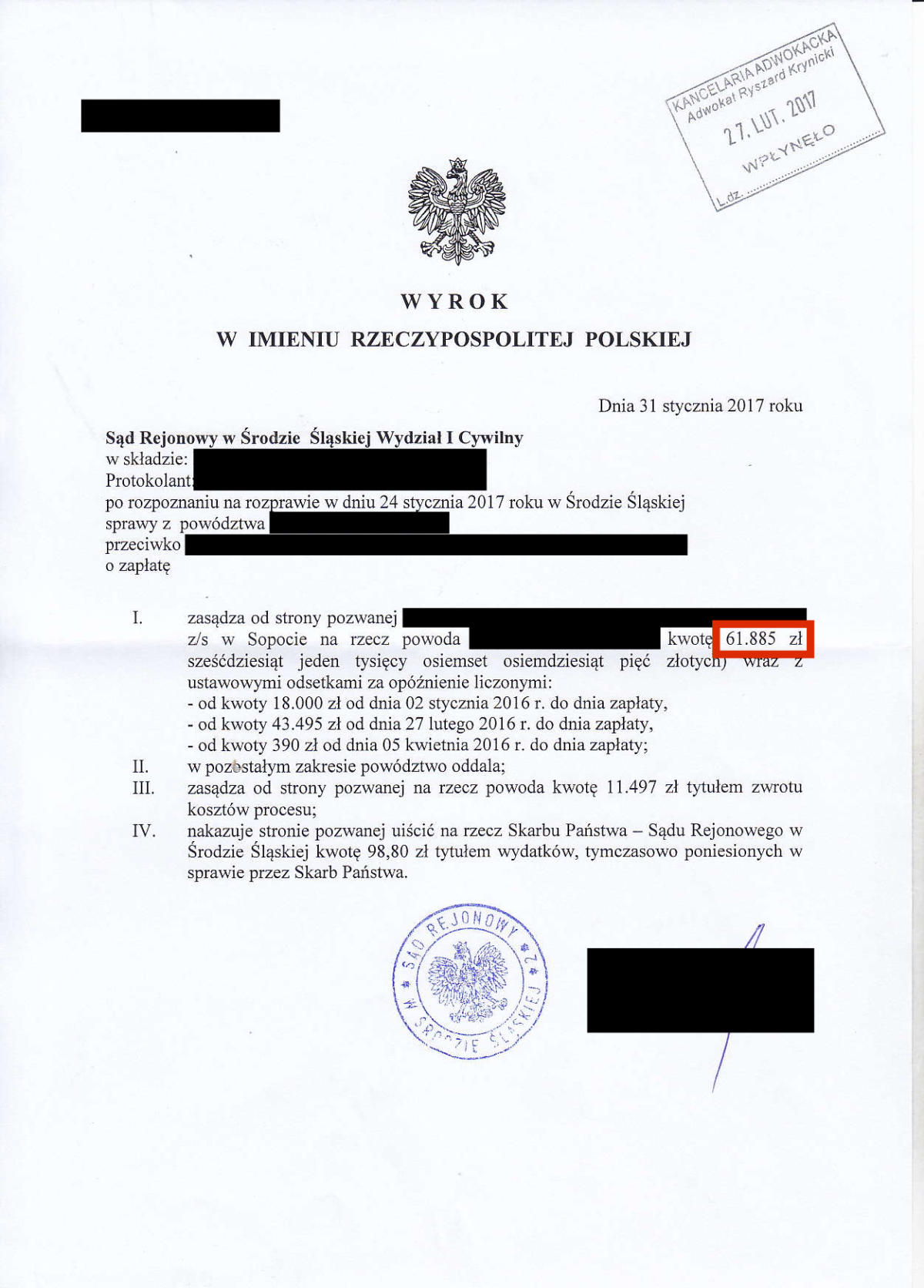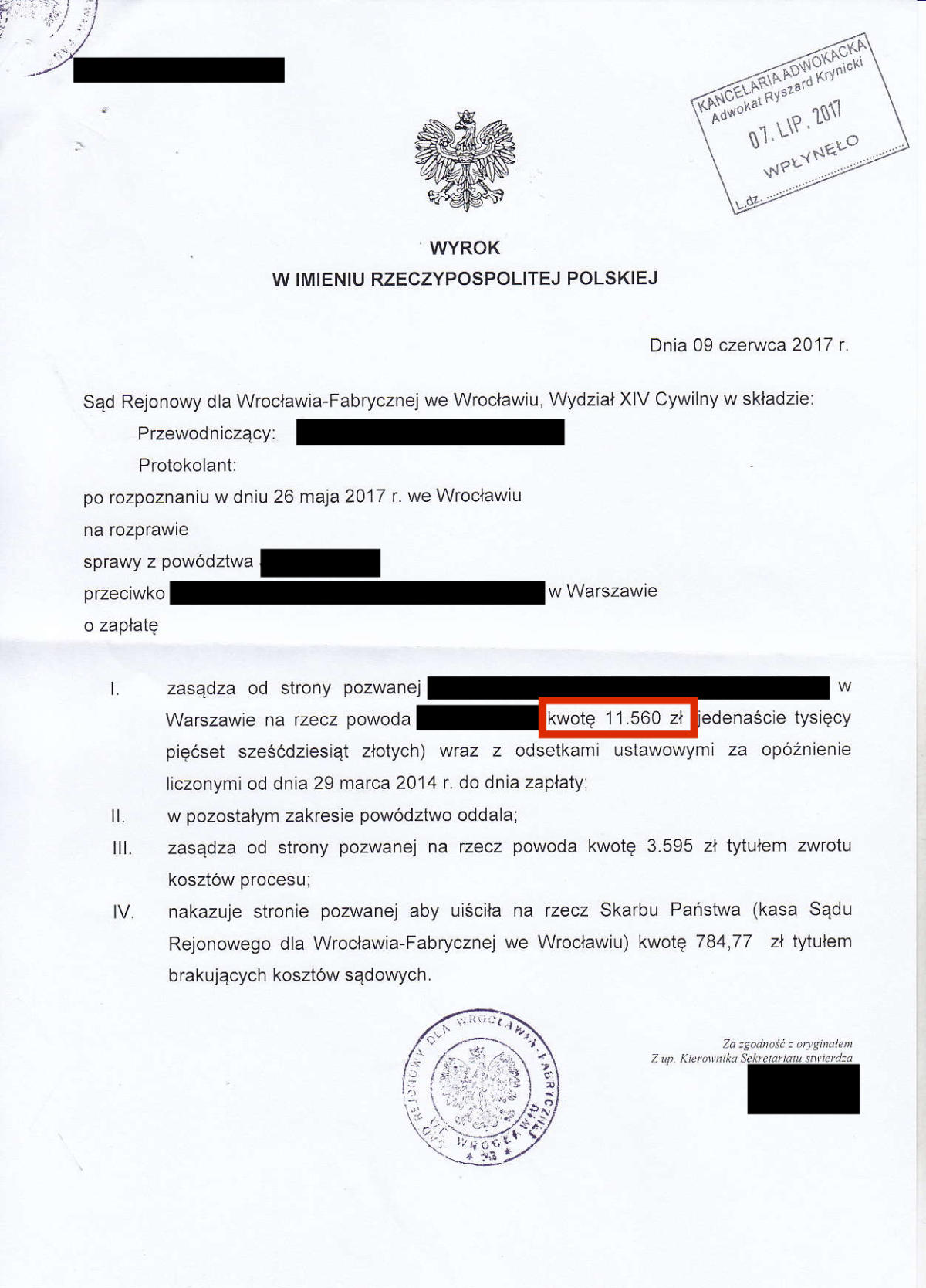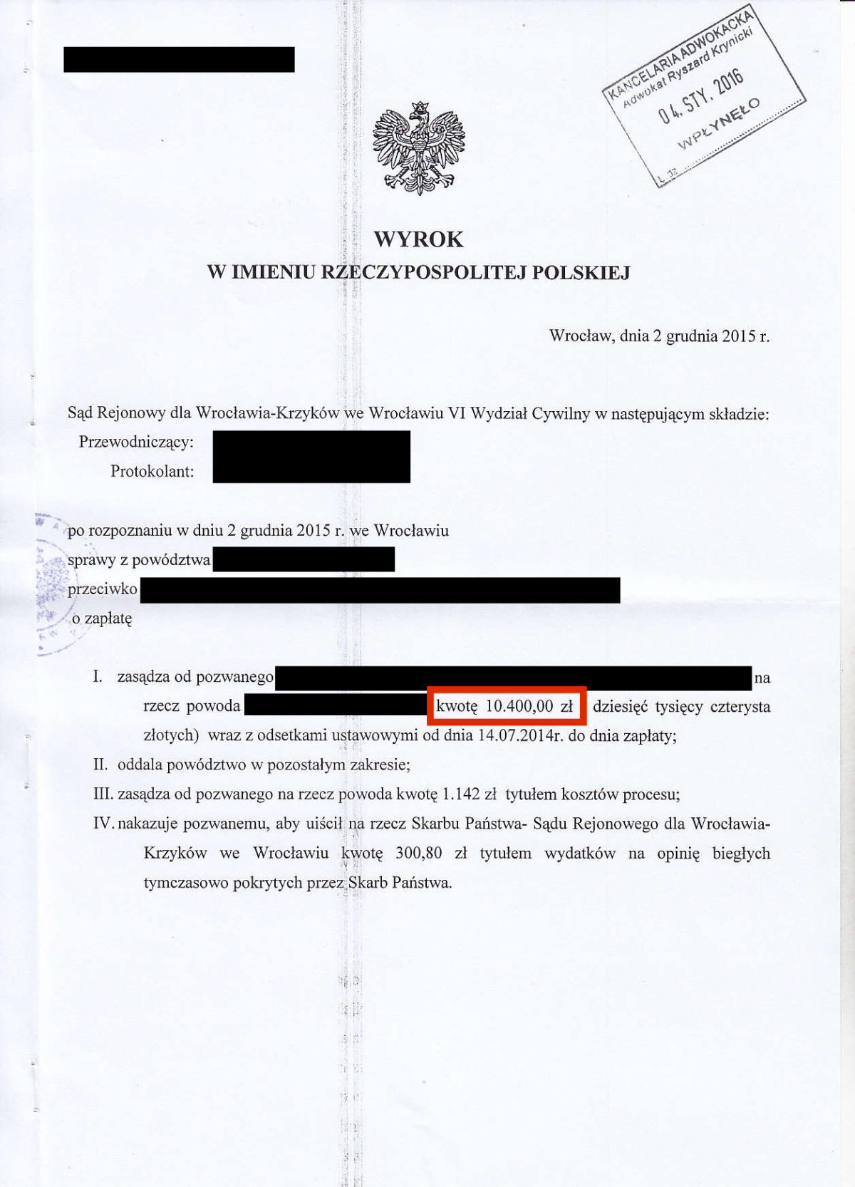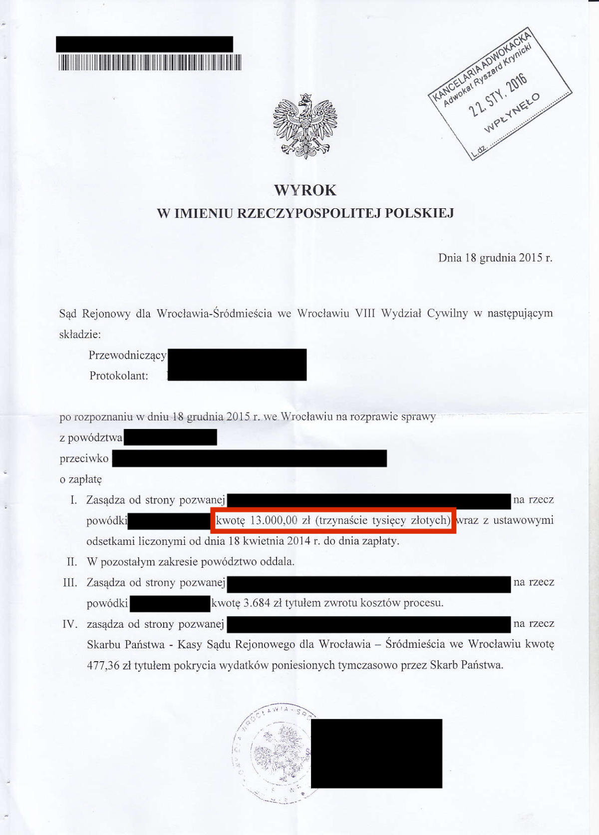 Przez ostatnie klika lat odzyskaliśmy dla Naszych klientów prawie 10.000.000 złotych. Poniżej przedstawimy kilkadziesiąt wybranych wyroków z Naszych spraw. Jest to tylko niewielki ułamek spraw, które do tej pory wygraliśmy. Odszkodowanie w wysokości 39.524 zł Odszkodowanie w wysokości 26.713 zł Odszkodowanie w wysokości 19.000 zł Odszkodowanie w wysokości 36.744 zł Odszkodowanie w wysokości 18.806,60 zł Odszkodowanie w wysokości 16.504,90 zł Odszkodowanie w wysokości 13.265 zł Odszkodowanie w wysokości 100.000 zł Odszkodowanie w wysokości 13.000 zł Odszkodowanie w wysokości 20.000 zł Odszkodowanie w wysokości 11.385 zł Odszkodowanie w wysokości 11.350 zł Odszkodowanie w wysokości 10.400 zł Odszkodowanie w wysokości 120.000 zł Odszkodowanie w wysokości 10.000 zł Odszkodowanie w wysokości 11.000 zł Odszkodowanie w wysokości 12.560,99 zł Odszkodowanie w wysokości 29.035,32 zł Odszkodowanie w wysokości 10.675 zł Odszkodowanie w wysokości 10.285 zł Odszkodowanie w wysokości 160.000 zł Odszkodowanie w wysokości 10.185 zł Odszkodowanie w wysokości 140.000 zł 23Odszkodowanie w wysokości 15.032 zł Odszkodowanie w wysokości 9.433 zł Odszkodowanie w wysokości 11.525 zł Odszkodowanie w wysokości 11.393,59 zł Odszkodowanie w wysokości 10.238 zł Odszkodowanie w wysokości 14.401,85 zł Odszkodowanie w wysokości 13.425 zł Odszkodowanie w wysokości 16.300 Odszkodowanie w wysokości 20.906,46 zł Odszkodowanie w wysokości 11.560 zł Odszkodowanie w wysokości 10.001 zł Odszkodowanie w wysokości 28.997 zł Odszkodowanie w wysokości 11.140 zł Odszkodowanie w wysokości 8.104 zł Odszkodowanie w wysokości 8.985 zł Odszkodowanie w wysokości 7.843 zł Odszkodowanie w wysokości 61.885 zł Odszkodowanie w wysokości 11.645 zł Odszkodowanie w wysokości 8.561 zł Odszkodowanie w wysokości 12.365 zł Odszkodowanie w wysokości 14.743,49 zł