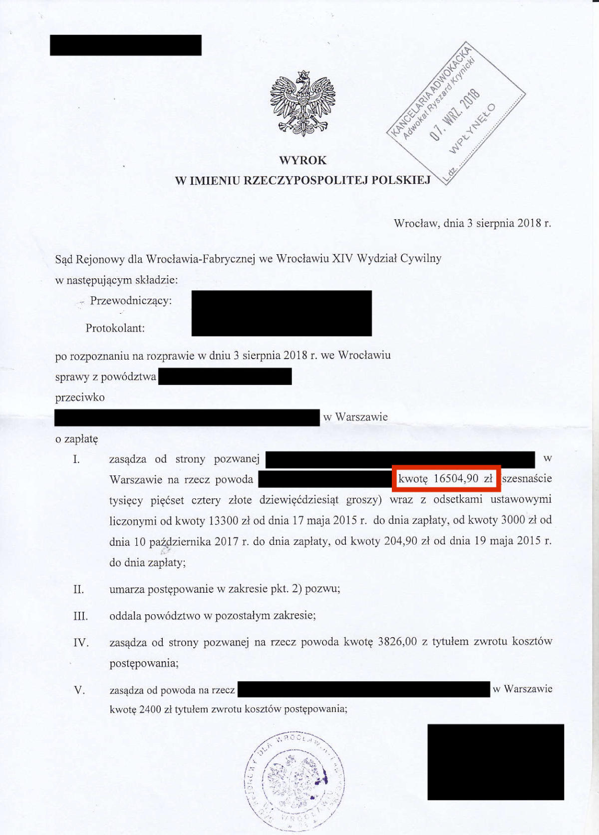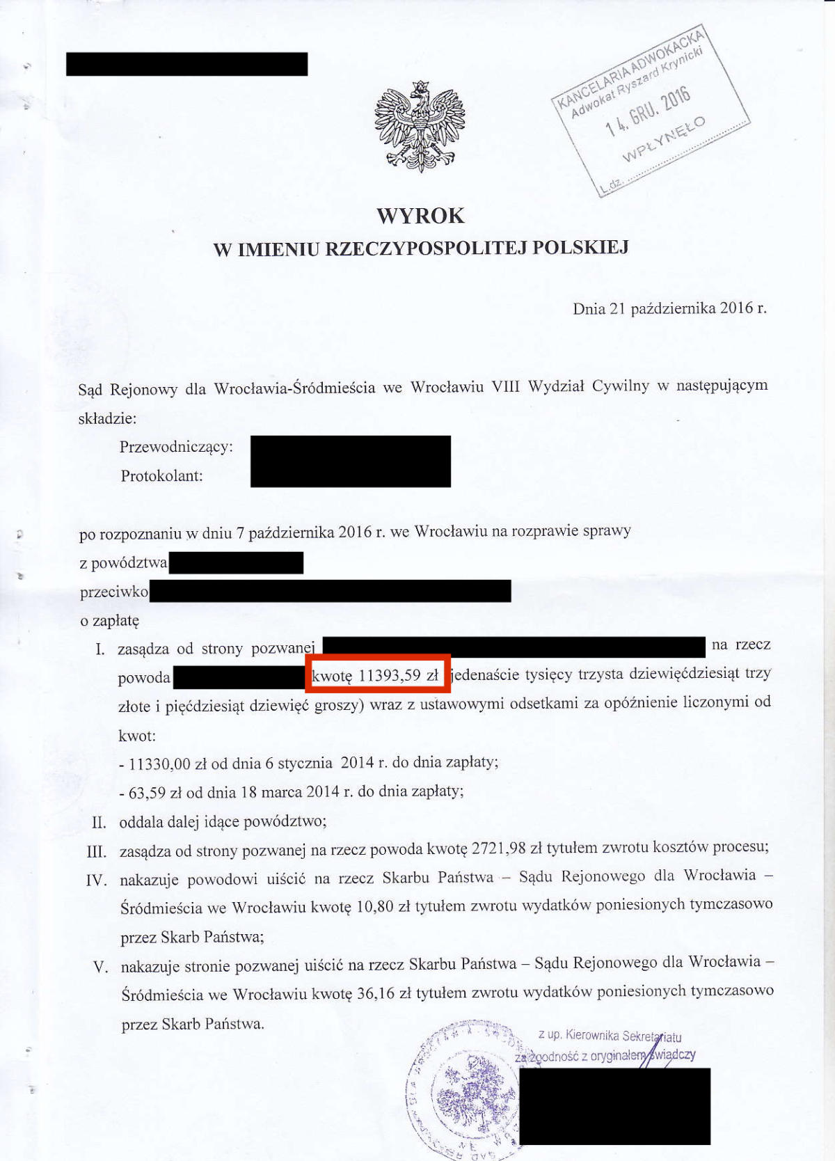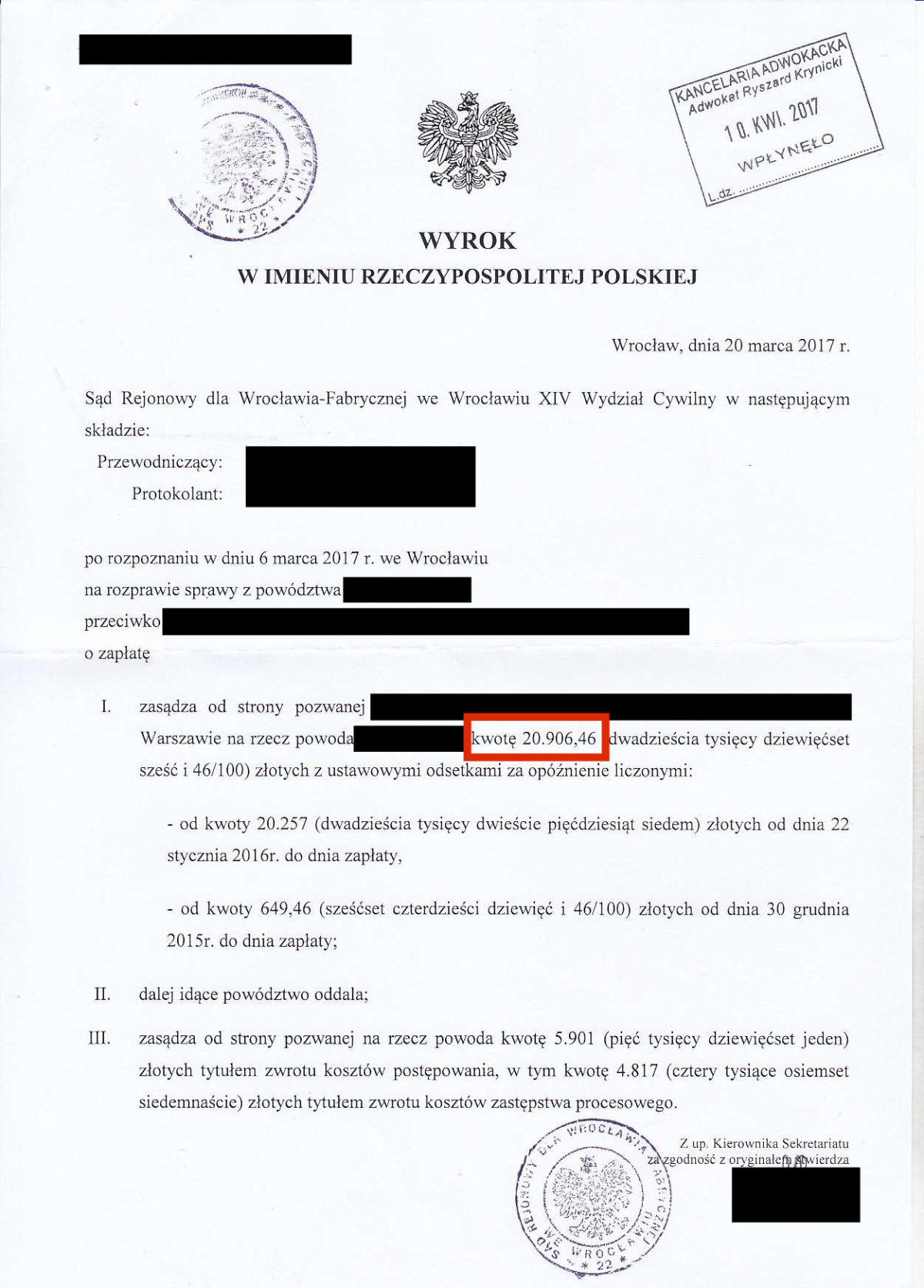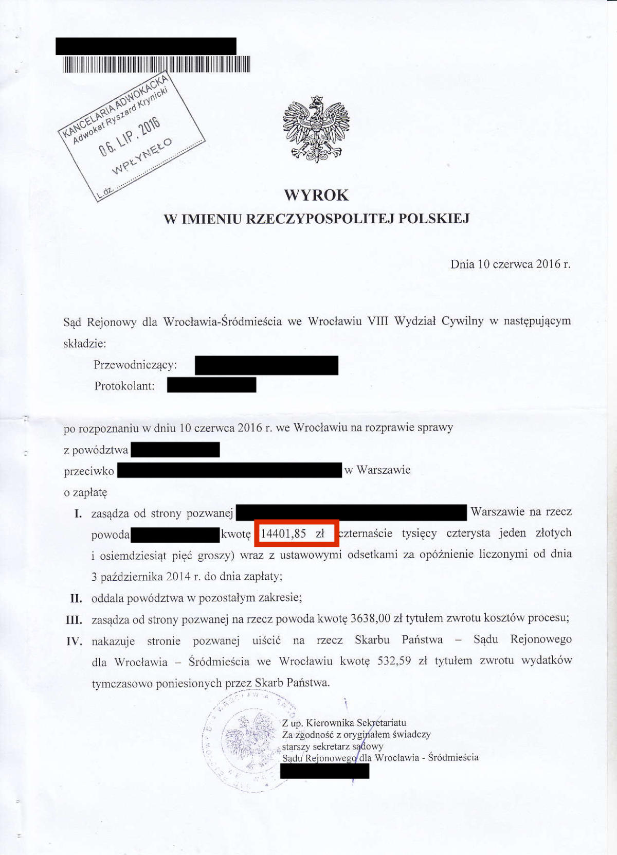 Przez ostatnie klika lat odzyskaliśmy dla Naszych klientów prawie 10.000.000 złotych. Poniżej przedstawimy kilkadziesiąt wybranych wyroków z Naszych spraw. Jest to tylko niewielki ułamek spraw, które do tej pory wygraliśmy. Odszkodowanie w wysokości 39.524 zł Odszkodowanie w wysokości 26.713 zł Odszkodowanie w wysokości 19.000 zł Odszkodowanie w wysokości 36.744 zł Odszkodowanie w wysokości 18.806,60 zł Odszkodowanie w wysokości 16.504,90 zł Odszkodowanie w wysokości 13.265 zł Odszkodowanie w wysokości 100.000 zł Odszkodowanie w wysokości 13.000 zł Odszkodowanie w wysokości 20.000 zł Odszkodowanie w wysokości 11.385 zł Odszkodowanie w wysokości 11.350 zł Odszkodowanie w wysokości 10.400 zł Odszkodowanie w wysokości 120.000 zł Odszkodowanie w wysokości 10.000 zł Odszkodowanie w wysokości 11.000 zł Odszkodowanie w wysokości 12.560,99 zł Odszkodowanie w wysokości 29.035,32 zł Odszkodowanie w wysokości 10.675 zł Odszkodowanie w wysokości 10.285 zł Odszkodowanie w wysokości 160.000 zł Odszkodowanie w wysokości 10.185 zł Odszkodowanie w wysokości 140.000 zł 23Odszkodowanie w wysokości 15.032 zł Odszkodowanie w wysokości 9.433 zł Odszkodowanie w wysokości 11.525 zł Odszkodowanie w wysokości 11.393,59 zł Odszkodowanie w wysokości 10.238 zł Odszkodowanie w wysokości 14.401,85 zł Odszkodowanie w wysokości 13.425 zł Odszkodowanie w wysokości 16.300 Odszkodowanie w wysokości 20.906,46 zł Odszkodowanie w wysokości 11.560 zł Odszkodowanie w wysokości 10.001 zł Odszkodowanie w wysokości 28.997 zł Odszkodowanie w wysokości 11.140 zł Odszkodowanie w wysokości 8.104 zł Odszkodowanie w wysokości 8.985 zł Odszkodowanie w wysokości 7.843 zł Odszkodowanie w wysokości 61.885 zł Odszkodowanie w wysokości 11.645 zł Odszkodowanie w wysokości 8.561 zł Odszkodowanie w wysokości 12.365 zł Odszkodowanie w wysokości 14.743,49 zł